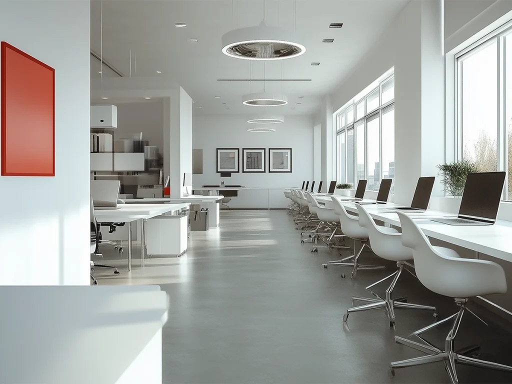 Open layouts allow easy teamwork and communication. Technology, like fast internet and smart devices, is important for modern work. The design focuses on minimalism, keeping things simple and neat. Every part of the space is made to be useful and stylish.